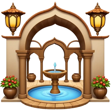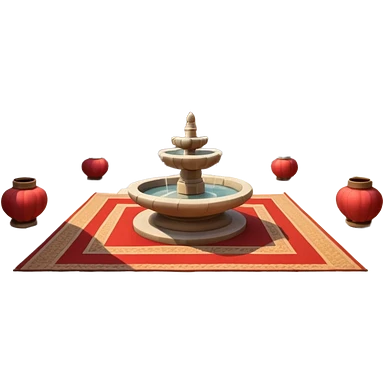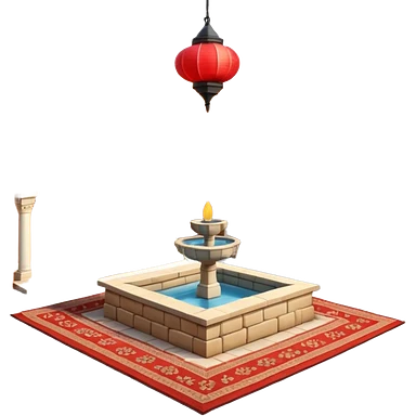 3D Apple-style emoji of a Turkish han courtyard. Square courtyard, small fountain, low arches, hanging lanterns, stacked carpets. Rounded, glossy, soft shadows, bright daylight, white background. emoji