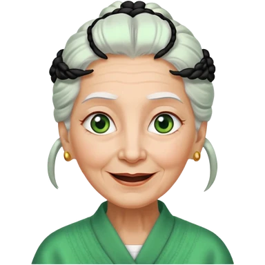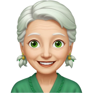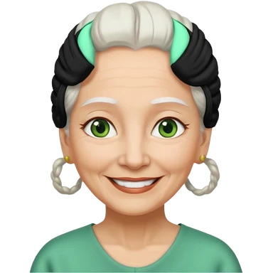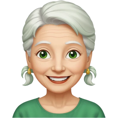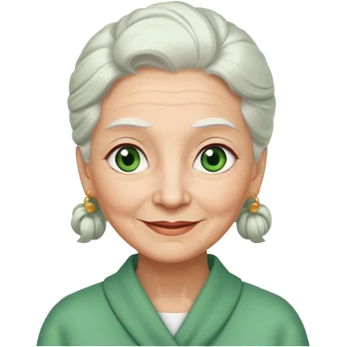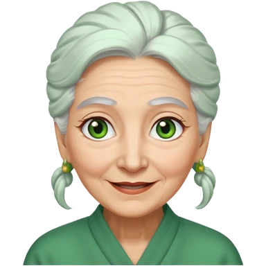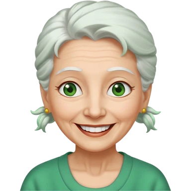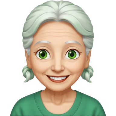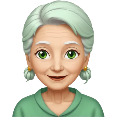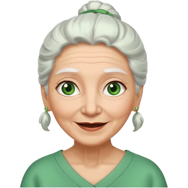 abuela con ojos verdes, pelo blanco, pelo blanco y amarrado, aspecto feliz, pelo blanco, no verde, solo verde los ojos emoji