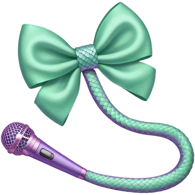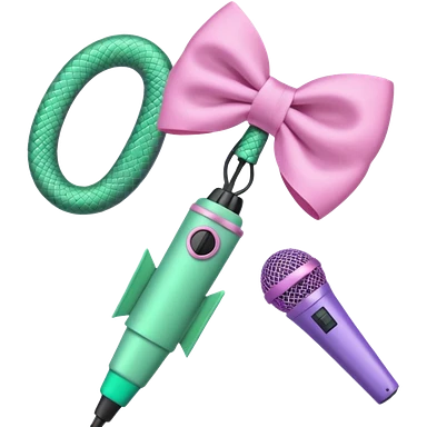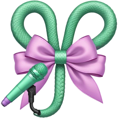 A pastel pink bow with a pastel green snake on the top of one side and a pastel purple microphone on the bottom of the other side emoji