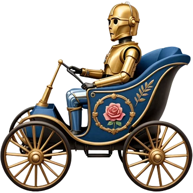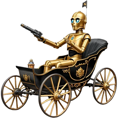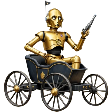 Action in Old American West tarnished C-3PO bounty policeman in 1864 delicately ornate rosegold accents painted buggy powered by electric motors and batteries with safety features and belts flying rapidly across rough dusty terrain stable on strong agile suspension and steering emoji