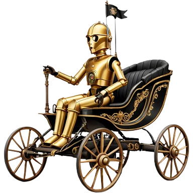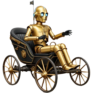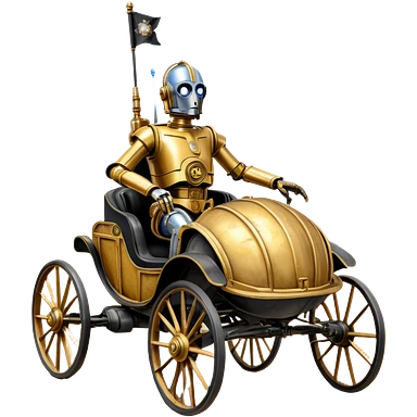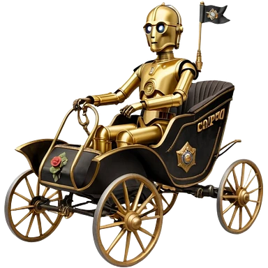 Action in Old American West tarnished C-3PO policeman in 1864 delicately ornate rosegold accents painted buggy powered by electric motors and batteries with safety features and belts flying rapidly across rough dusty terrain emoji
