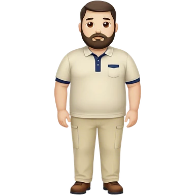 big man with medium size body a short full beard and short hair, dark hair light skin and chubby face with shaped beard. i like to wear polo shirt with creme pants, no chans no, ring no accesories emoji