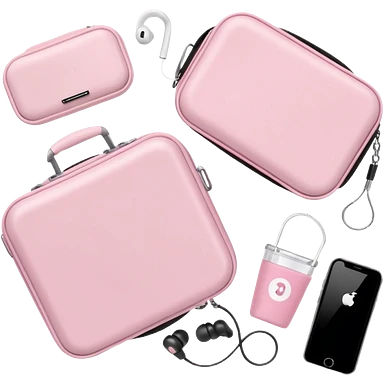 Travel accessories flatlay: pastel pink luggage scale, earbuds case, clear water cup, soft fabric emoji