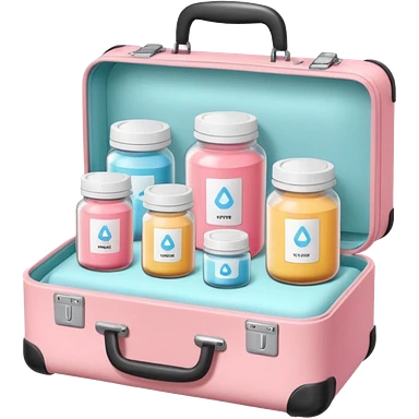 Transparent vitamins jar with blush electrolyte sachets displayed on a pastel pink suitcase emoji