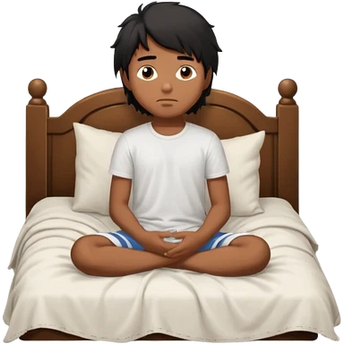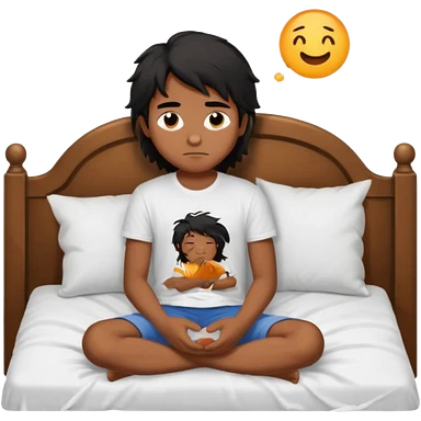 generate a pretty bratz brown skinned boy with black messy long hair wearing a white tshirt sitting in his in bed. Looking sleepy emoji