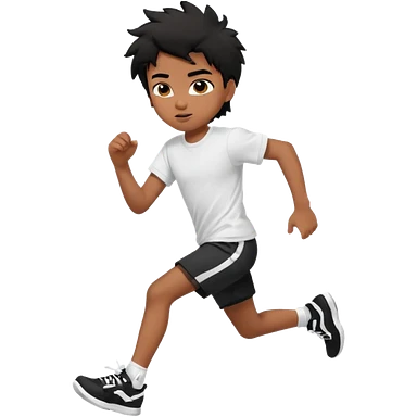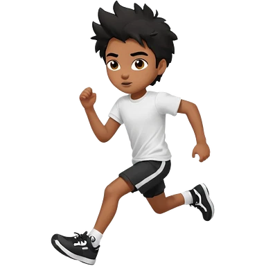 generate a pretty bratz brown skinned boy with black messy hair wearing a white tshirt and black running shorts. running on the street with white sneakers emoji