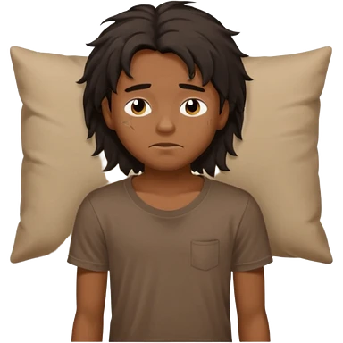 generate a pretty bratz brown skinned boy with black messy long hair wearing a brown tshirt in bed. Looking sleepy emoji