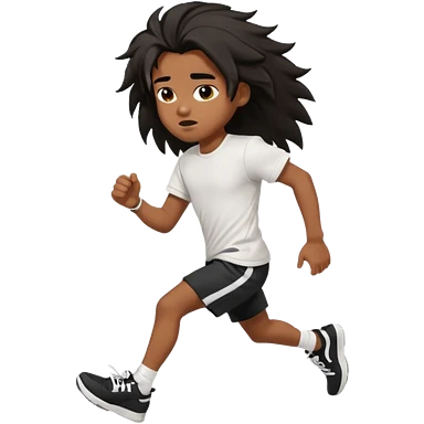 generate a pretty bratz brown skinned boy with black messy long hair wearing a white tshirt and black running shorts. running on the street with white sneakers emoji