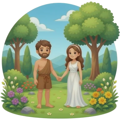 Adam and Eve wear fig leaves in the garden of Eden in the background emoji
