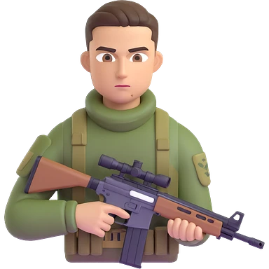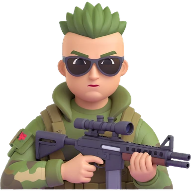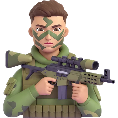 Add camouflage face paint to the muscular soldier, keep the spiky hair and sniper rifle, preserve 3D emoji style, no background. emoji | AI Emoji Generator
