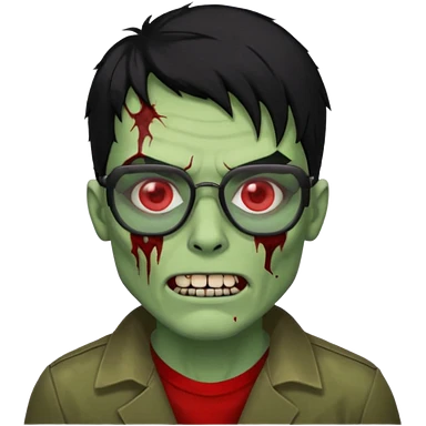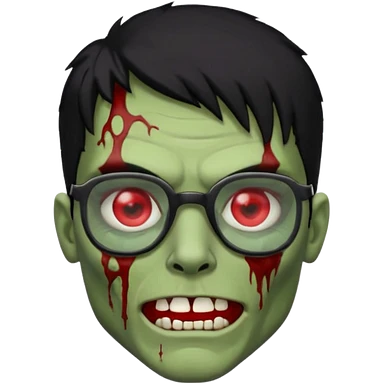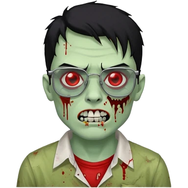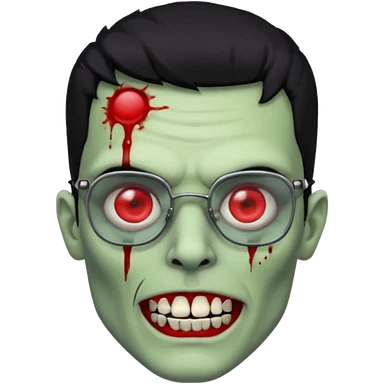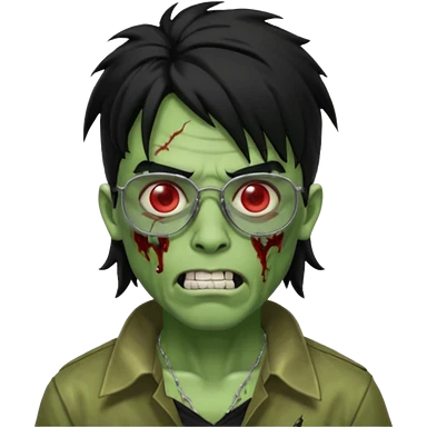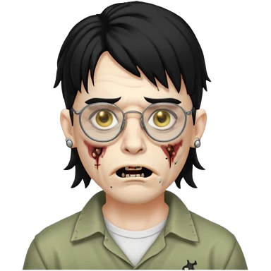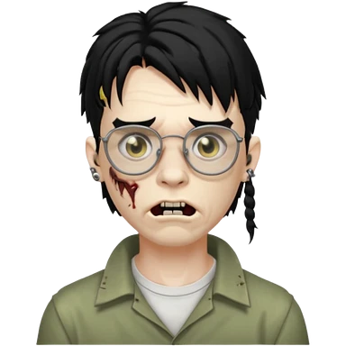 homem zumbi de óculos cabelo preto com muita olheira deixar pele dele verde dentes brancos e olhos vermelhos e ensanguentados deixar óculos quadrado e preto e olhos cheio de veias vermelhas e encher o rosto de piercings colocar piercing em todo rosto emoji