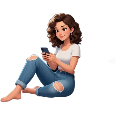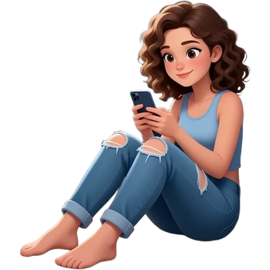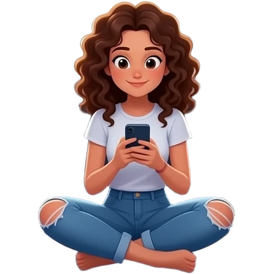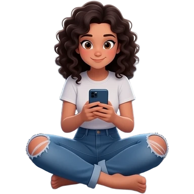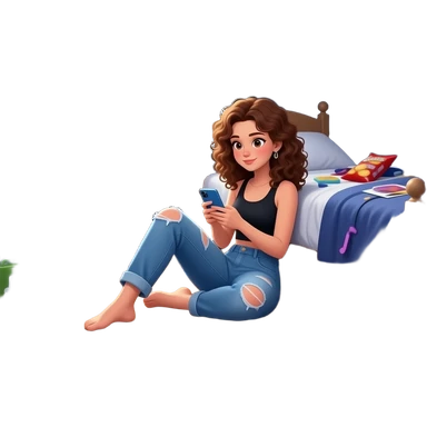 adolescente mujer sentada en el piso de una habitación desordenada tipica de adolescente, con ventana medio cerrada, colores mas bien oscuros,en el centro de una habitación, usando el celular, con elementos alrededor que representen bienestar integral: música, movimiento, alimentación emoji | AI Emoji Generator