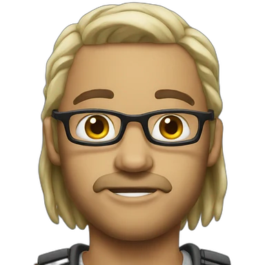 small photo realistic Ralf Hutter from Kraftwerk, short straight black hair, Dark Brown eyes, black glasses, thin, black shirt, beside Tesla emoji