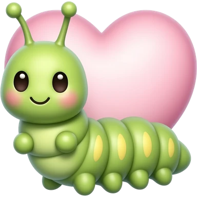 Adorable green itty bitty tiny little catipillar with tiny hearts on each body sectioncrawling up the side of a big muted pink colored heart emoji