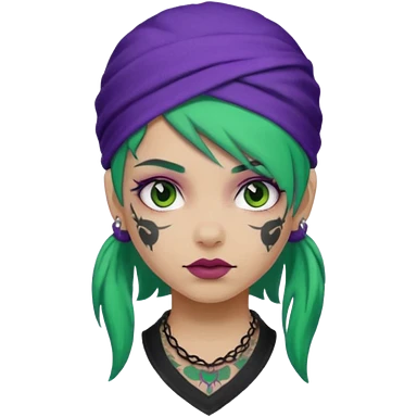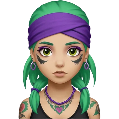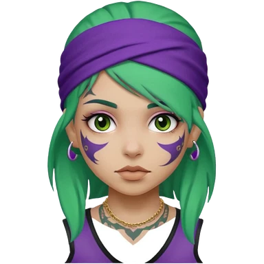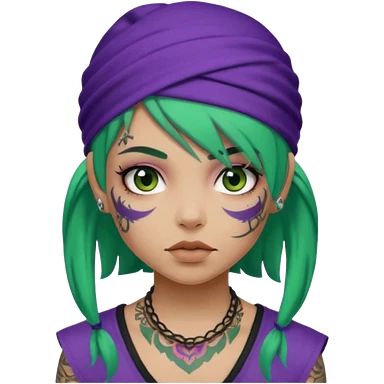 green hair with purple head bandana and lots of face tattoo girl emoji
