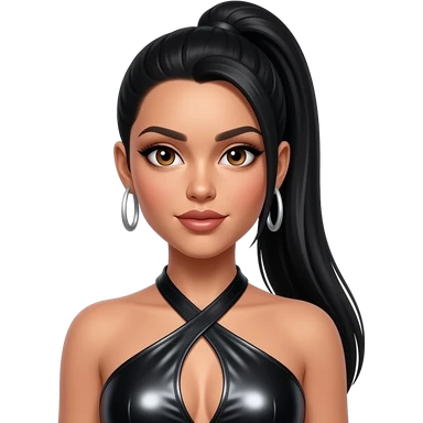 Kiely Williams from 3lw with hazel eyes, long straight black high ponytail hair, black metallic halter dress, silver earrings emoji