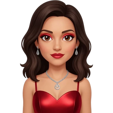 Kiely Williams from 3lw with hazel eyes, long black hair, red eyeshadow and lipstick, red metallic sweetheart dress, silver necklace and earrings emoji