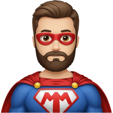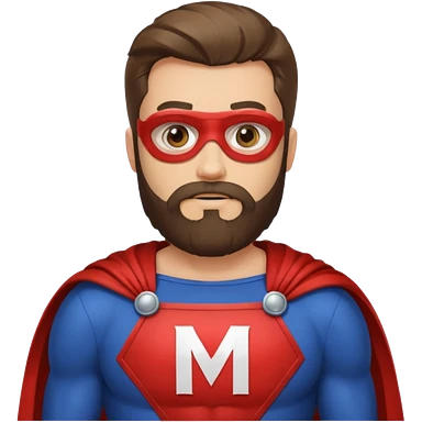 бородатый мужчина в костюме супер героя с буквой М на груди emoji