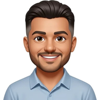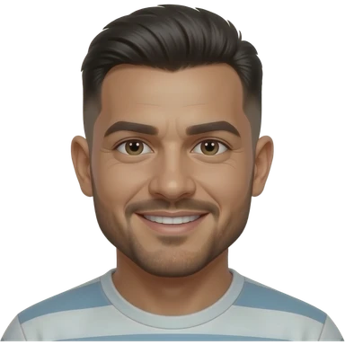 Adult, 30 years old, brown skin, Brazilian, short faded sides, low quiff on top, clean-shaven beard, medium mustache, smiling, small eyes, dark eyes, (don't make it so realistic) emoji | AI Emoji Generator