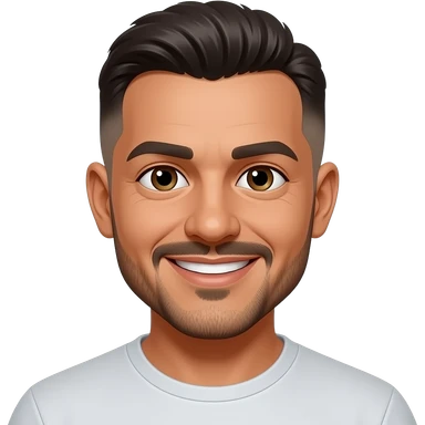 Adult, 30 years old, soft brown skin, Brazilian, short faded sides, low quiff on top, clean-shaven beard, medium mustache, smiling, interedium size eyes (don't make it so realistic) emoji