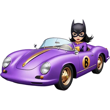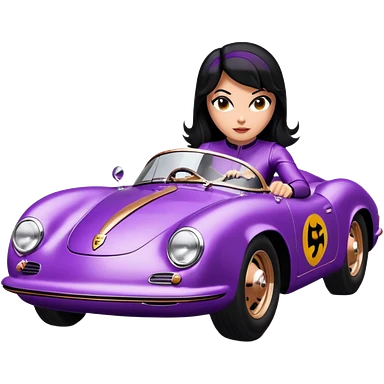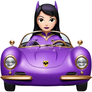 Adult tight purple suit wearing BatGirl driving her satin-black and rose-gold 1955 Porsche 550 Spyder too fast in the country, despite the rainy conditions making the tires slippery, sliding sideways with her black hair fluttering in the wind emoji