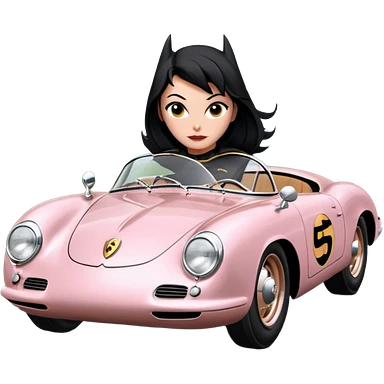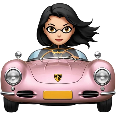 Adult BatGirl driving her satin-black and rose-gold 1955 Porsche 550 Spyder too fast in the country, despite the rainy conditions making the tires slippery, sliding sideways with her black hair fluttering in the wind emoji