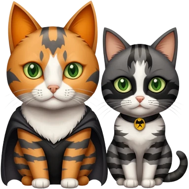A grey tabby cat with dark grey stripes and green eyes sitting next to a calico cat with orange eyes, calico cat has dark fur around her eye almost like a Batman mask emoji