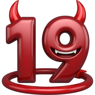 "A glossy 3D emoji of the number 19, deep crimson red color, with sharp demonic horns on top, a pointed devil tail curling around the base, and a menacing villainous grin, high detail, white background." emoji