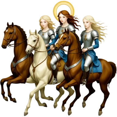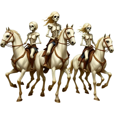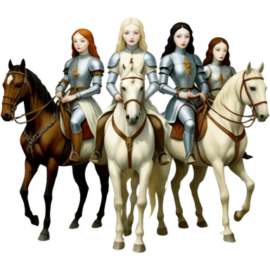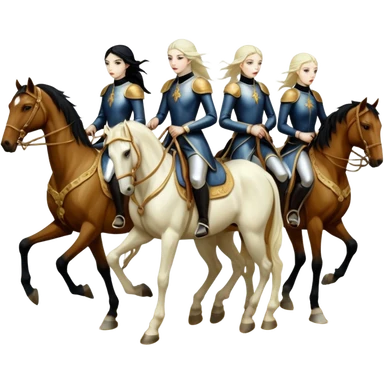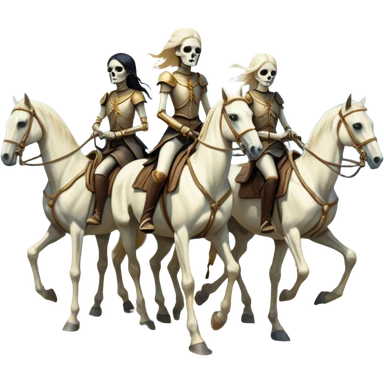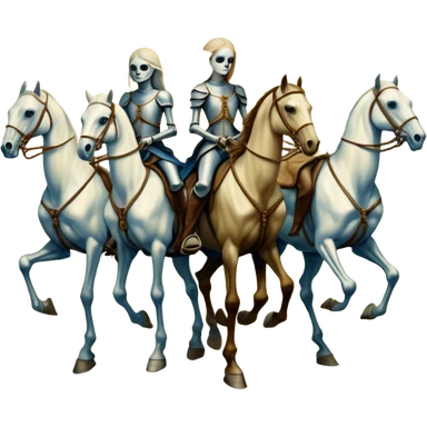 aesthetic brilliant radiant divine lighting, oil paint - ivory Four thin women as riders of the Apocalypse, after a graphic by Albrecht Dürer in a desolate landscape on horse skeletons emoji