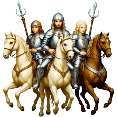 aesthetic shiny glowing divine lighting, oil paint - ivory The Four Horsemen of the Apocalypse, based on a graphic by Albrecht Dürer emoji