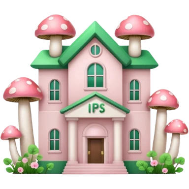 Pale Pink and green cute bank building, mushrooms growing around it , clean aesthetic, two PP letters on it emoji