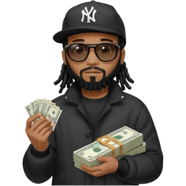 African American man with shoulder length black dreadlocks with black beard wearing black sunglasses wearing a black New York Yankees logo baseball cap wearing a black bubble winter coat with hands out in balancing position emoji