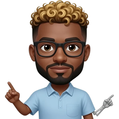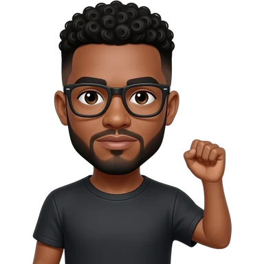 African American dark brown skin man with shoulder length black dreadlocks in on a braided hair style wearing black glasses with black moustache and beard separated with slightly chubby face emoji
