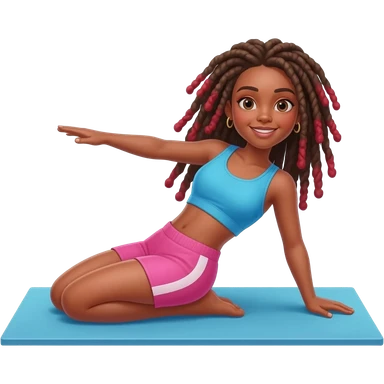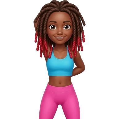 African American girl with long brown dreadlocks with red tips, pink workout leggings and a bright blue cropped top in a stretching pose emoji