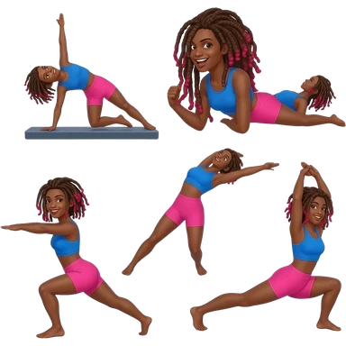 African American girl with long brown dreadlocks with red tips, pink workout shorts and a bright blue cropped top in various Pilates positions emoji