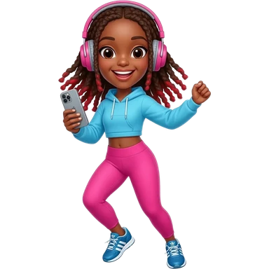 African American girl with long brown dreadlocks with red tips, pink workout leggings and a bright blue cropped hoodie, wearing big pink headphones and blue adidas pumps, happy dancing phone in hand emoji