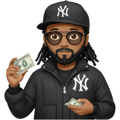 African American man with shoulder length black dreadlocks with black beard wearing black sunglasses wearing a black New York Yankees logo baseball Cap wearing a black bubble winter coat counting money in his hand emoji