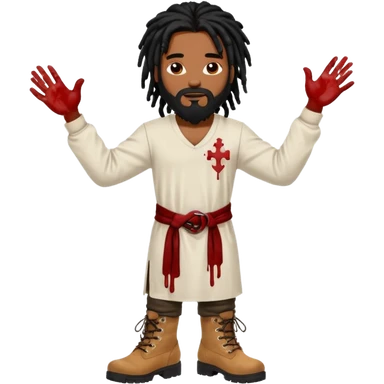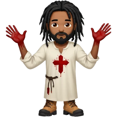 African American man with shoulder length black dreadlocks with black beard wearing a white tunic with blood on it wearing timberland boots with hands out emoji