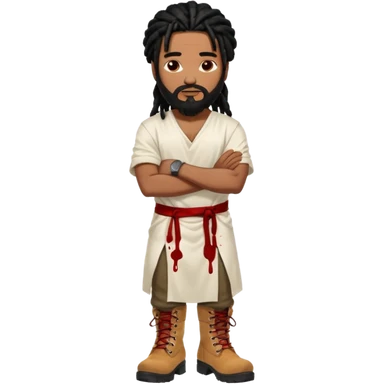 African American man with shoulder length black dreadlocks with black beard wearing a white tunic with blood on it wearing timberland boots with arms folded together emoji
