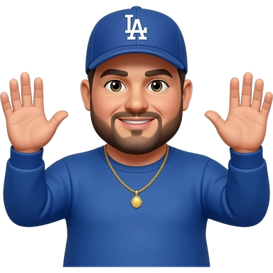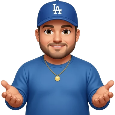chubby man with a light honey skin complextion with lightly shaved black beard wearing a blue Los Angeles Dodgers baseball cap wearing a long sleeve blue shirt wearing a gold tennis necklace holding hands out emoji