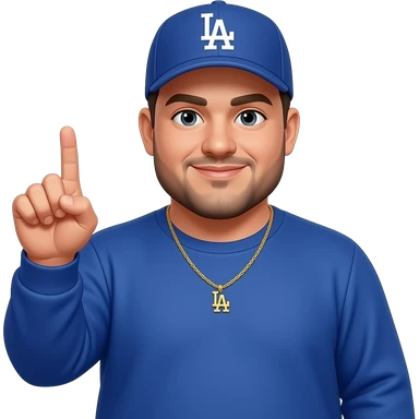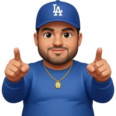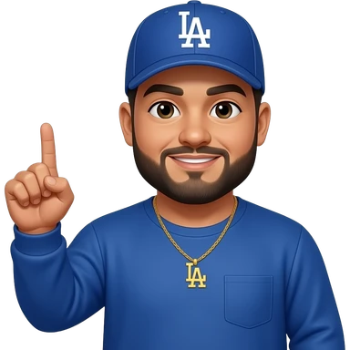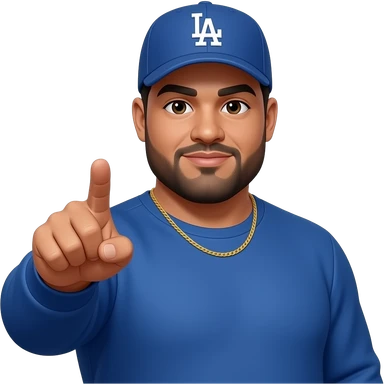 chubby man with a light honey skin complextion with lightly shaved black beard wearing a blue Los Angeles Dodgers baseball cap wearing a long sleeve blue shirt wearing a gold tennis necklace pointing up emoji
