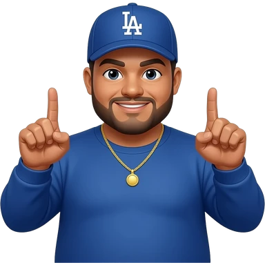 chubby man with a honey skin complextion with lightly shaved black beard wearing a blue Los Angeles Dodgers baseball cap wearing a long sleeve blue shirt wearing a gold tennis necklace pointing up emoji