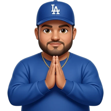 chubby man with a light honey skin complextion with lightly shaved black beard wearing a blue Los Angeles Dodgers baseball cap wearing a long sleeve blue shirt wearing a gold tennis necklace with prayer hands emoji