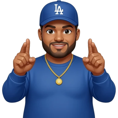 African American man with a beige skin complextion with lightly shaved black beard wearing a blue Los Angeles Dodgers baseball cap wearing a long sleeve blue shirt wearing a gold tennis necklace emoji | AI Emoji Generator