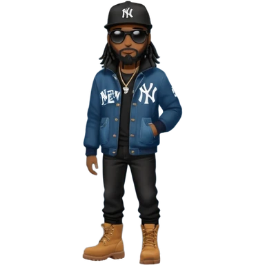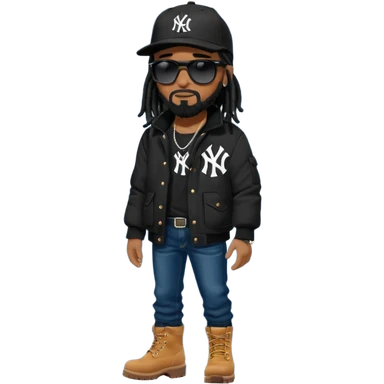 African American man with shoulder length black dreadlocks wearing black sunglasses with black bubble winter coat wearing a New York Yankees baseball hat with arms folded wearing denim skinny jeans and timberland boots emoji