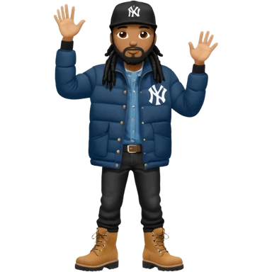 African American man with shoulder length black dreadlocks with black beard wearing black sunglasses wearing a black New York Yankees logo baseball cap wearing a black bubble winter coat wearing denim skinny jeans and Timberland boots with on hand in his pocket and on hand raised emoji