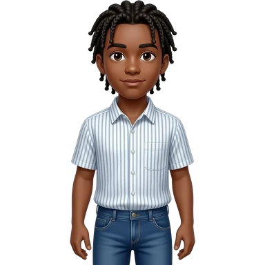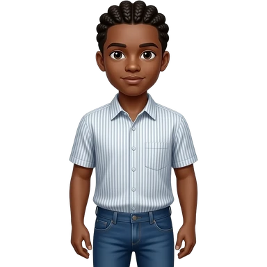 African American teenage boy with cornrow braids wearing a short sleeve button up shirt with thin vertical stripes pattern on it wearing navy blue denim jeans emoji