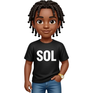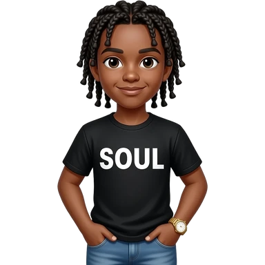 African American teenage boy with cornrow braids wearing a black shirt with the word soul on it in white capital letters wearing jeans wearing a gold watch emoji