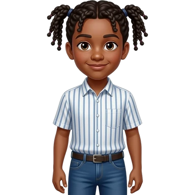 African American teenage boy with two individual shoulder length cornrow braids wearing a short sleeve button down shirt with thin vertical stripes pattern on it wearing navy blue denim jeans emoji