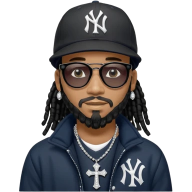 African American man with shoulder length black dreadlocks with black beard wearing black sunglasses wearing a New York Yankees logo baseball cap wearing a black bubble winter coat with diamond cross necklace on his neck emoji